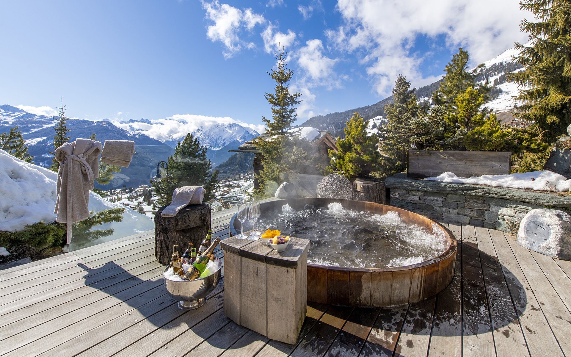 The comfortable and elegant spa setting includes a wellness corner, where a la carte massages are provided by a team of meticulously selected experienced therapists. We can also arrange yoga, pilates, and physiotherapy within the comfort of our luxury Spa. The yoga terrace alongside the jacuzzi provides spectacular Alpine views, and is a popular workout zone for our clients.
