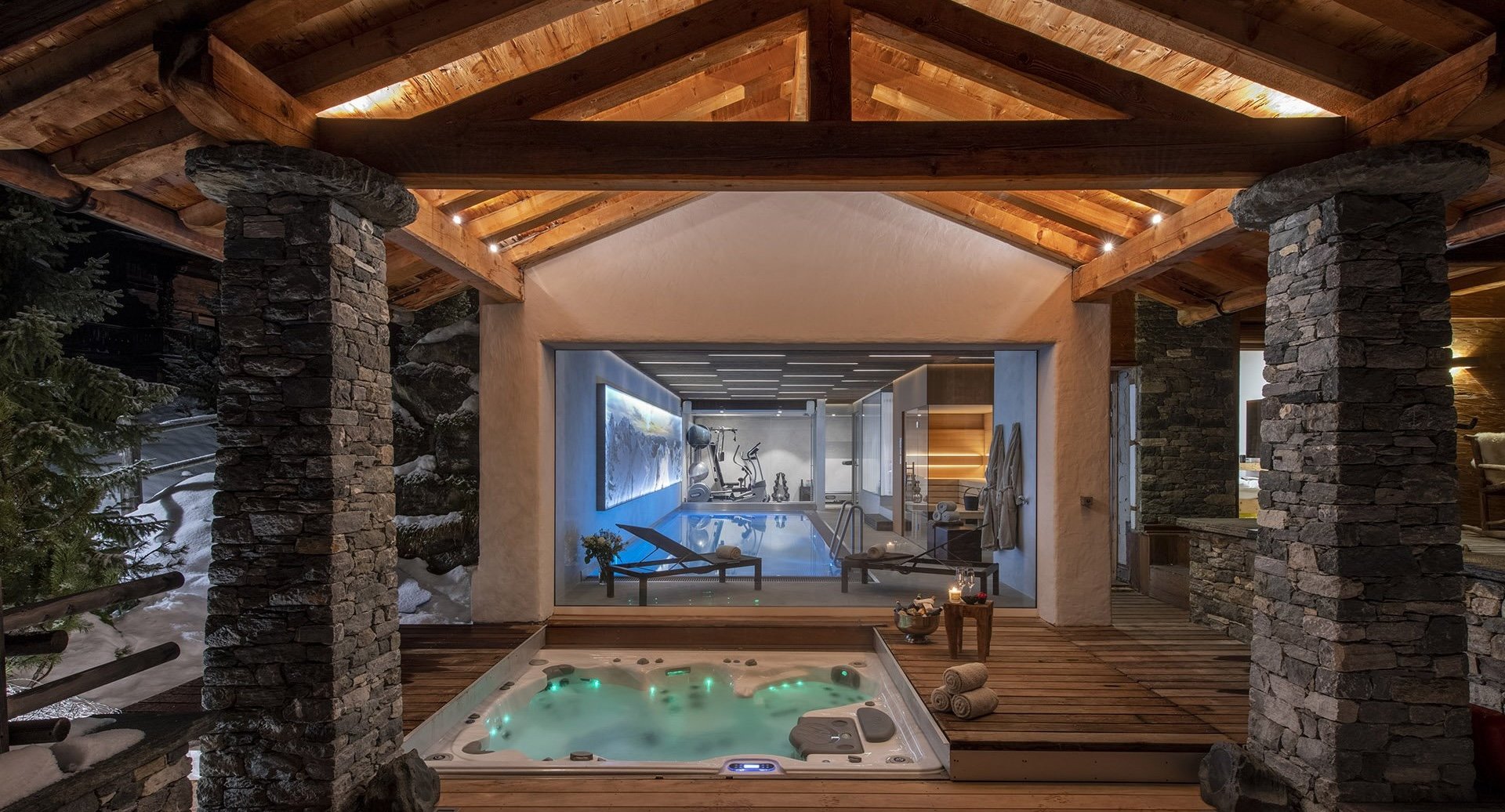 The full sized ‘window wall’ at the end of the pool allows for a landscape view of the terrace, garden, and mountains beyond. In the evening, the underwater lights further enhance the relaxed, opulent feeling of the spa.